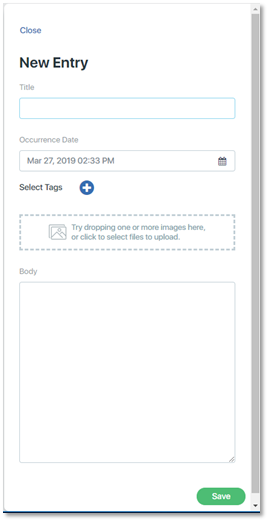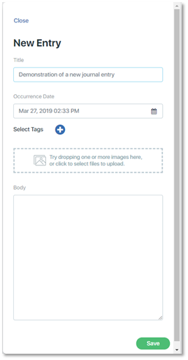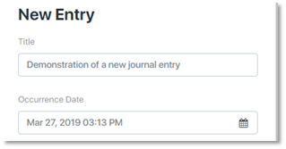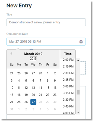 Date of Occurrence: Each journal entry is stored with the date and time it was created. If the event that is being described in the journal entry occurred at a different time or date, enter the date and time of occurrence in the field labeled Occurrence Date. The default value for this field is the date and time when the journal entry was created.