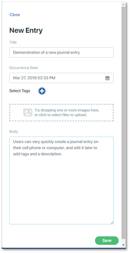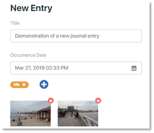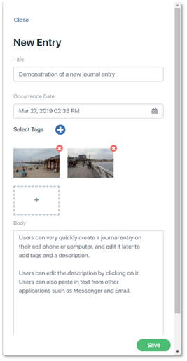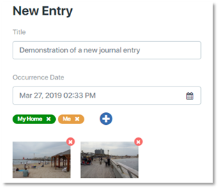 The journal entry will appear with the title, tags, and the date and time it was created. If you attached one or more photos, an icon will appear for each photo with the photo's file name.