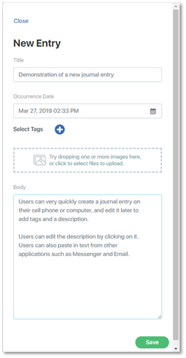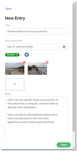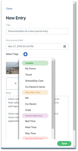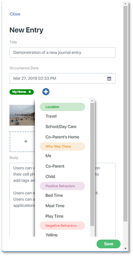 To select and add a tag, click on it. In this example, the tag “My Home” was added. The tag list will close and the selected tag will move to the tag section of the journal entry below the Occurrence Date.